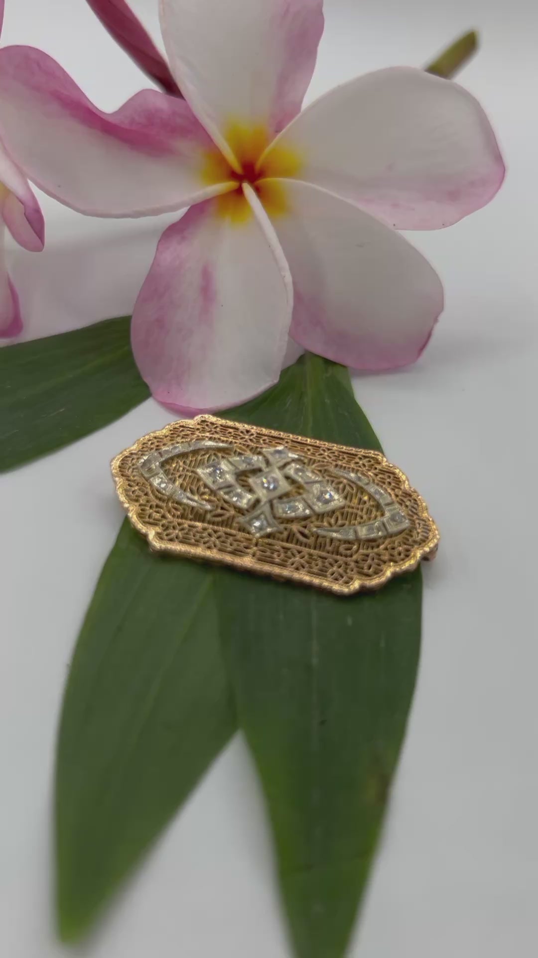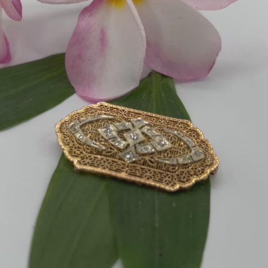 A series of dazzling diamonds have been set against a latticework of intricate gold filigree to create this timeless brooch.