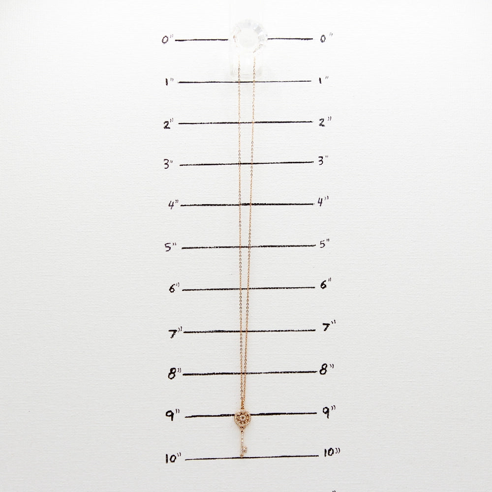 This quaint pendant features a skeleton key design, complete with rose gold and diamonds.