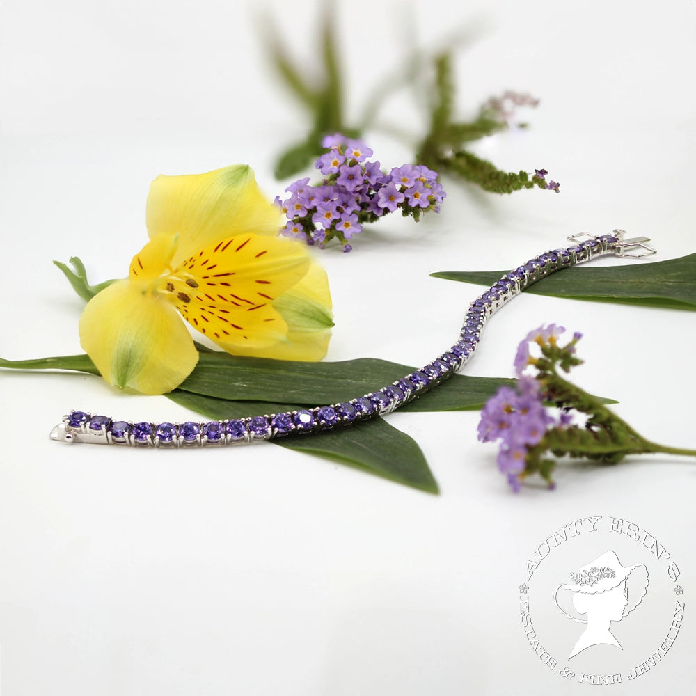 A little something just for fun, this well made, heavy weight tennis bracelet has hidden slide lock closure with side safety latch and is set with super sparkly deep lavender CZs.