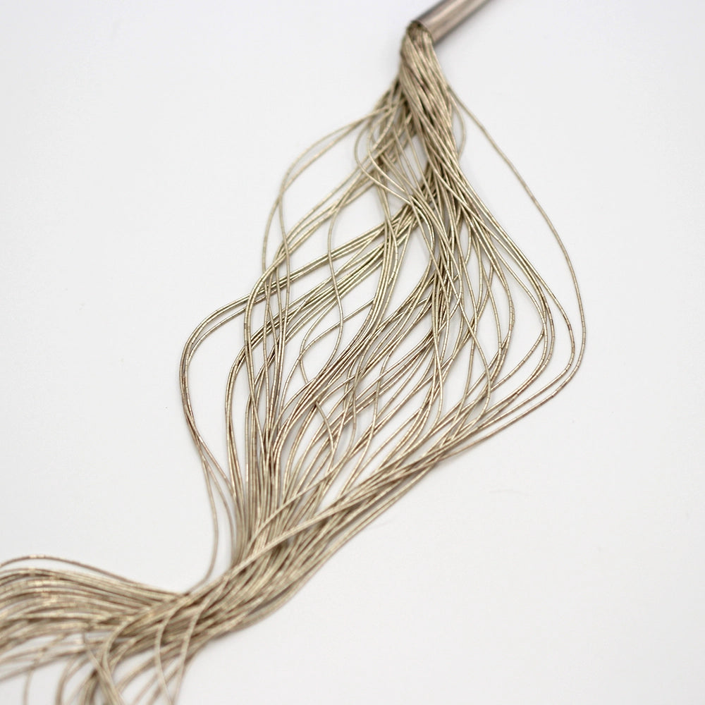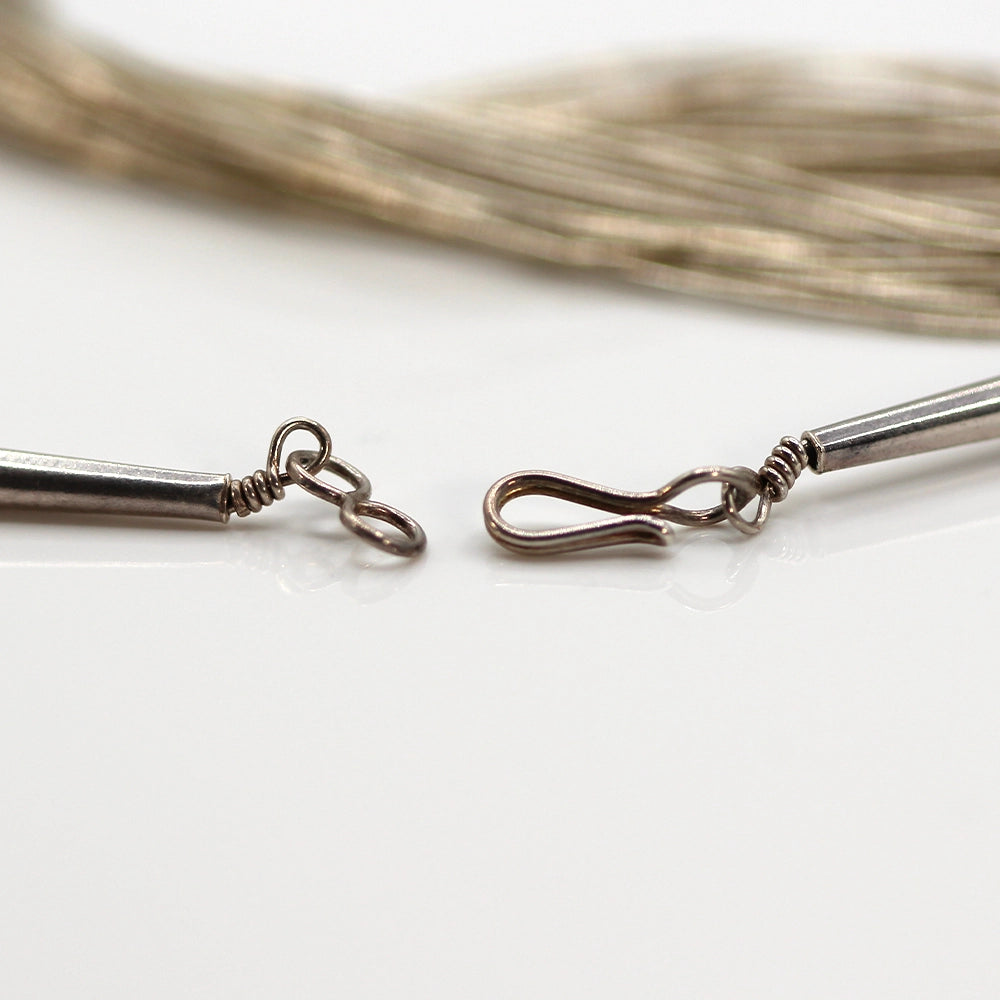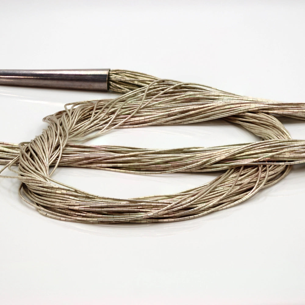 Commonly referred to as ‘Liquid Silver’ this vintage necklace features fifty strands of delicate silver beads. These strands have been twisted together into a single unit that slinks and shines with every move!